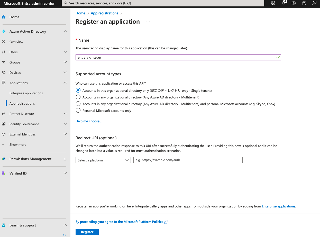 Issuer 用にアプリの登録を進める。