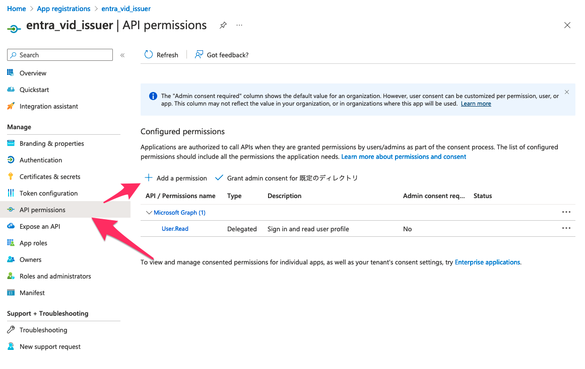 次にサイドバーの「API Permissions」へ。「Add a permission」