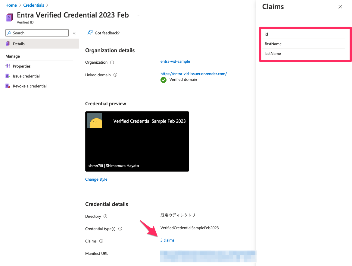 { "locale": "ja-JP", "card": { "title": "Verified Credential Sample Feb 2023", "issuedBy": "shmn7iii | Shimamura Hayato", "backgroundColor": "#000000", "textColor": "#ffffff", "logo": { "uri": "https://entra-vid-issuer.onrender.com/.well-known/icon.png", "description": "Verified Credential Sample Feb 2023 Logo" }, "description": "DID勉強会用に作成したVCです。" }, "consent": { "title": "Do you want to get your Verified Credential?", "instructions": "Sign in with your account to get your card." }, "claims": [ { "claim": "vc.credentialSubject.id", "label": "ID", "type": "String" }, { "claim": "vc.credentialSubject.firstName", "label": "First Name", "type": "String" }, { "claim": "vc.credentialSubject.lastName", "label": "Last Name", "type": "String" } ] }