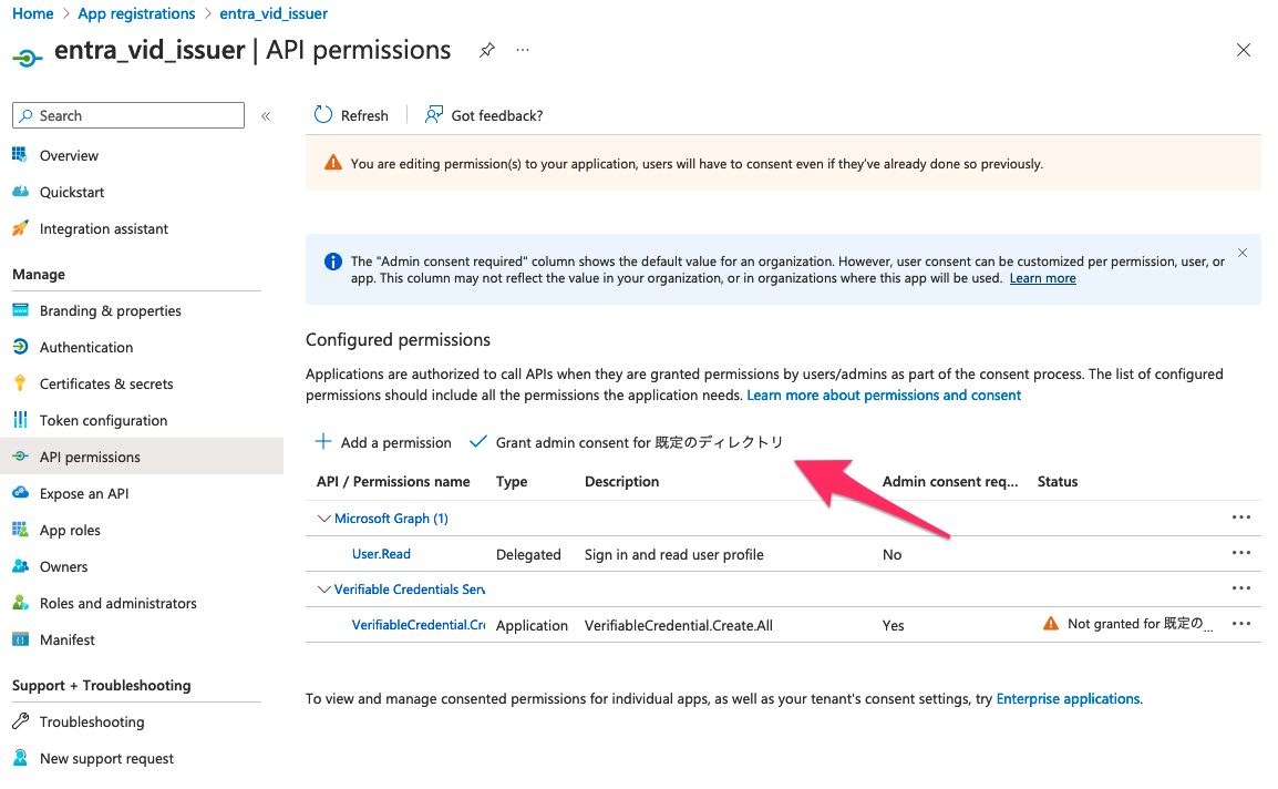 最後に「Grant consent for 規定のディレクトリ」を押下。
