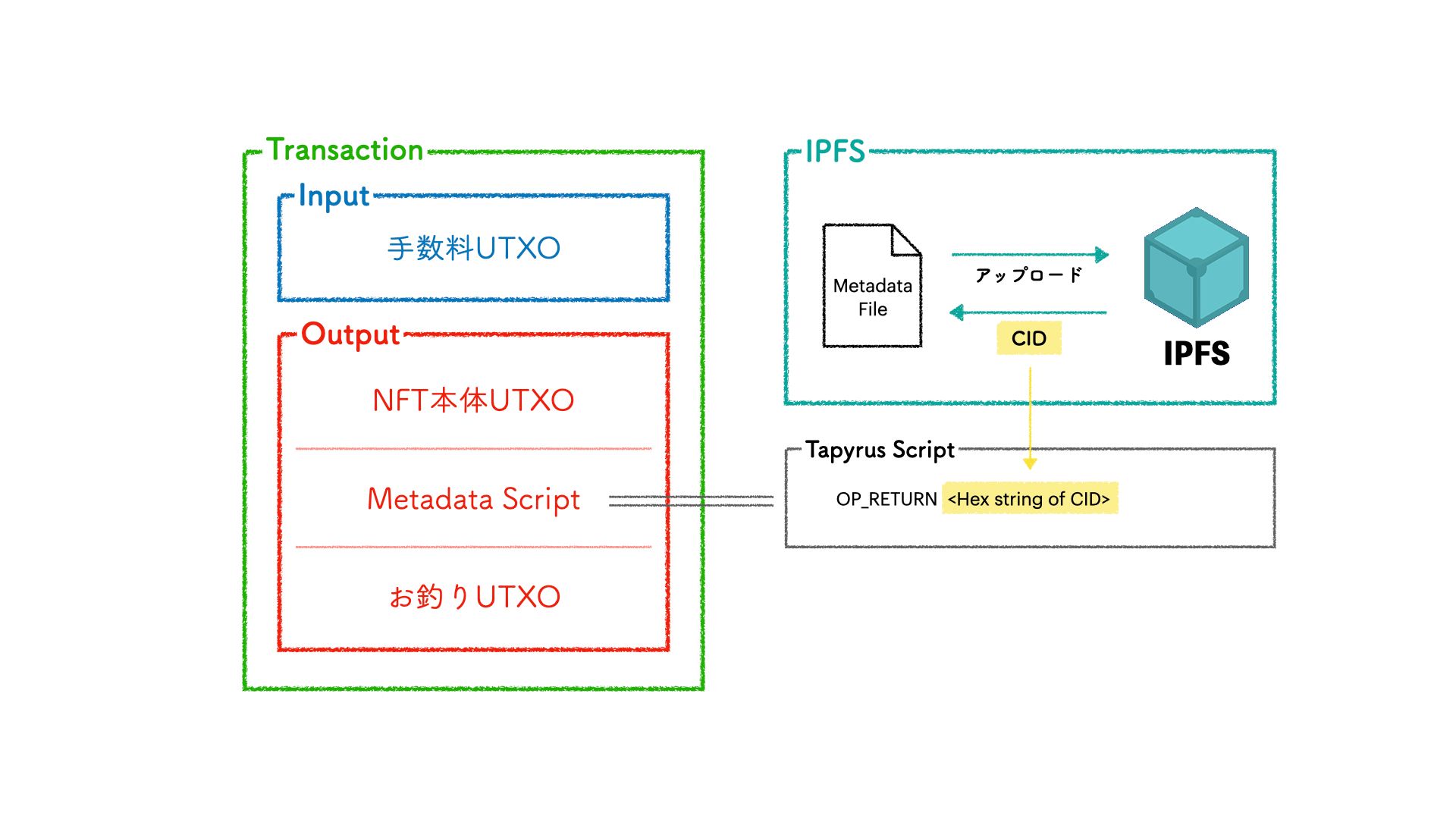 「NFT発行トランザクションのアウトプットに『IPFSへアップロードした任意MetadataファイルのCIDをOP_RETURNの後ろに入れたアウトプット』を追加」しました。