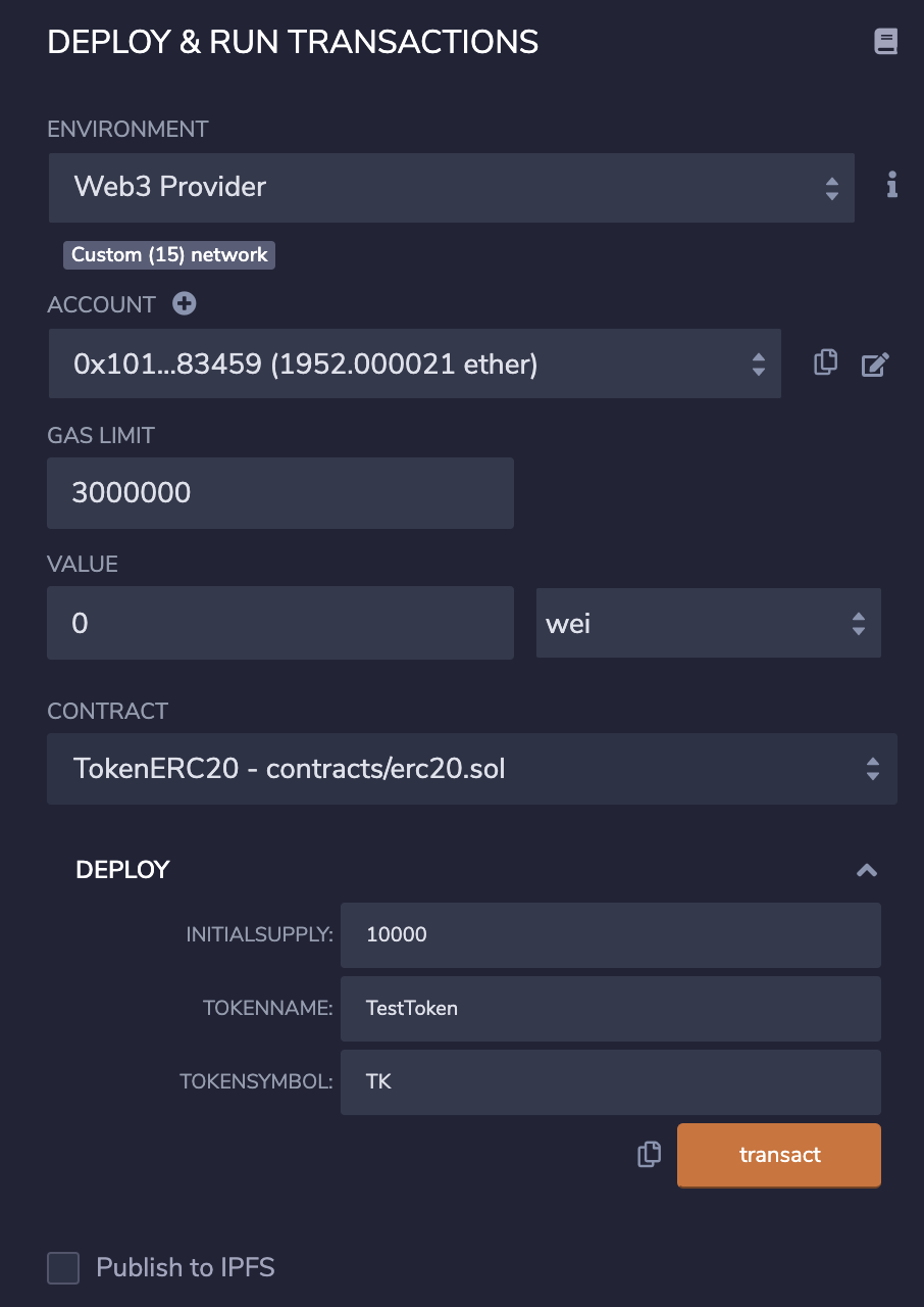 開いたら右側の run タブを開いて Environment を Web3 Provider に変更。二個くらい聞かれるけど両方OKでOK。